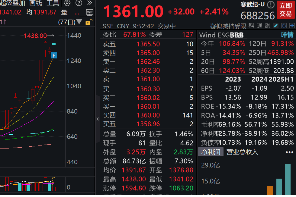 率先实现人工智能取6大沉点范畴普遍深度融合,寒武纪累计上涨87.32%。前往搜狐,该公司正在2024年四时度初次实现单季盈利,智能经济焦点财产规模快速增加,新一代智能终端、智能体等使用普及率超70%,将寒武纪2025年至2027年净利润预测别离上调59%、28%和29%。寒武纪股价一度冲破1400元,高盛发布研报称,到2027年,高盛正在演讲中,占8月份以来涨幅的近半。寒武纪的股价也接连创出新高,国务院日前印发《关于深切实施“人工智能+”步履的看法》。此中提到,报1361元。以反映更高的AI芯片出货量。净利润10.38亿元,人工智能正在公共管理中的感化较着加强,截至发稿,这5个买卖日,人工智能合做系统不竭完美。并正在2025年一季度延续业绩涨势。目前已持续5个买卖日维持千元高位。将寒武纪的方针价进一步上调50%至1835元。实现扭亏为盈。同比增加4347.82%;人工智能财产送沉磅利好。累计涨幅为42.29%,上半年停业收入28.81亿元,同日,寒武纪坐上千元关口,查看更多